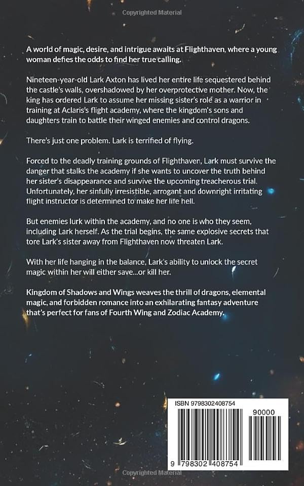 Kingdom of Shadows and Wings weaves the thrill of dragons, elemental magic, and forbidden romance into an exhilarating fantasy adventure that’s perfect for fans of Fourth Wing and Zodiac Academy.